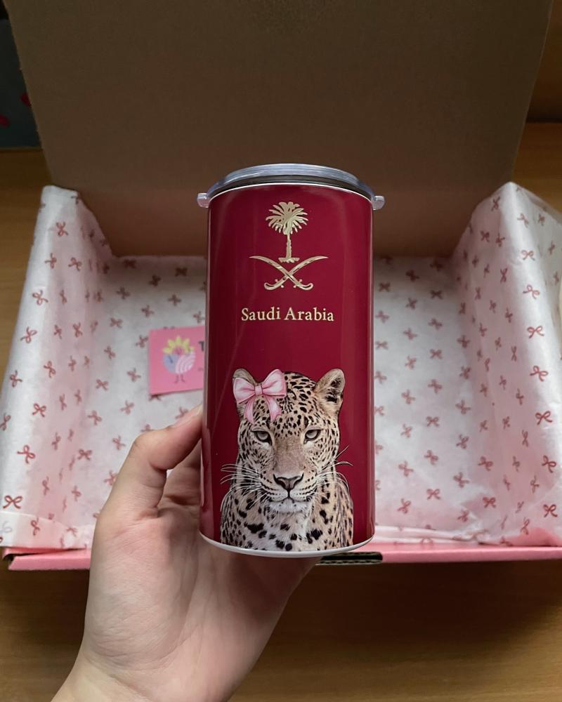 مق بتصميم فاخر يجمع بين شخصية النمر القوية وشعار السعودية 🇸🇦، قطعة مميزة تعكس القوة والفخامة مع كل رشفة.